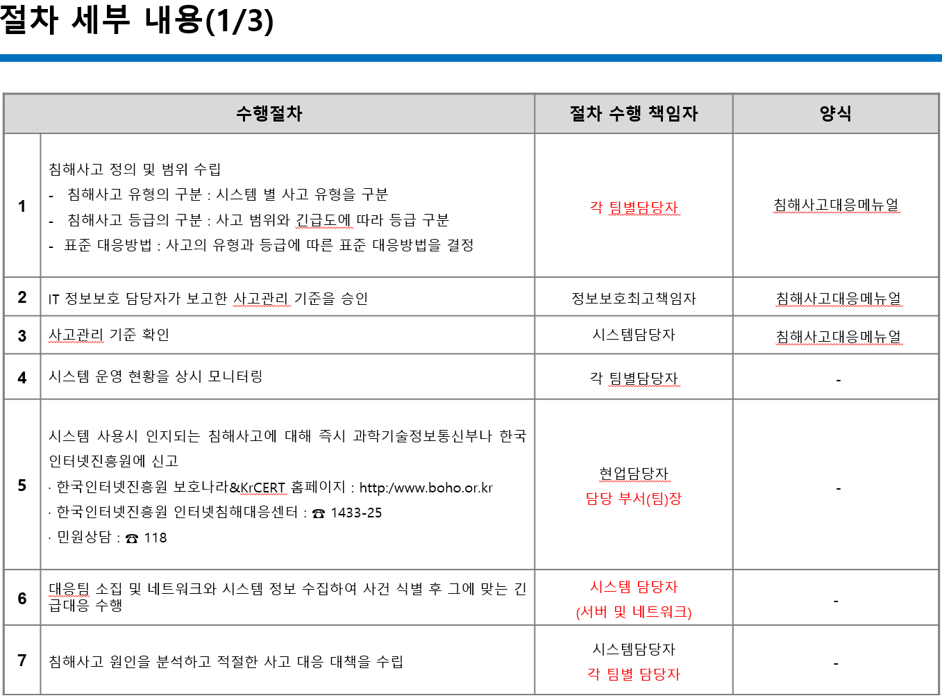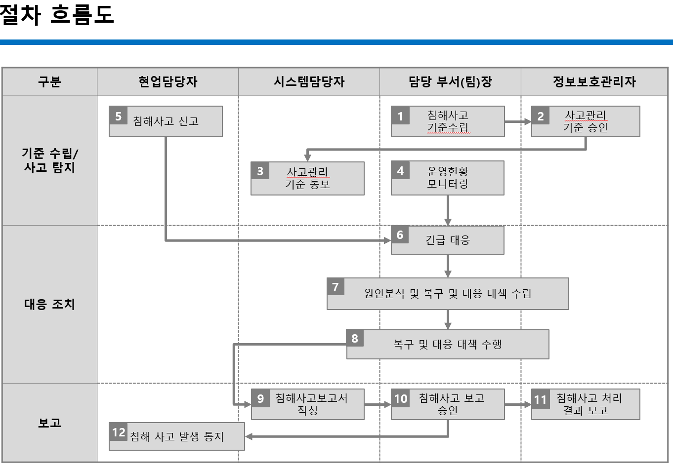 - 침해사고 발생 시 기록, 보고, 사고전파 절차