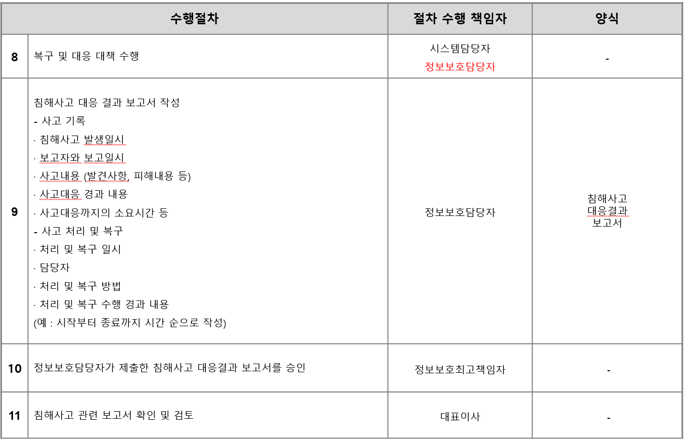 침해사고 대응절차 및 침해사고 대응 매뉴얼을 작성해야 합니다.