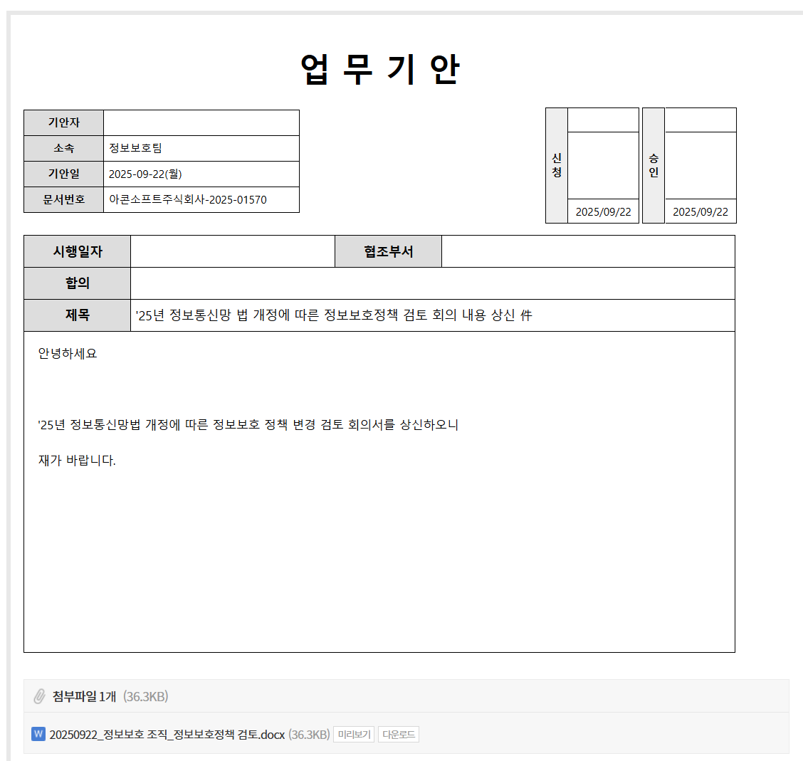 ■정보보호 정책 및 시행문서는 최소 연 1회 이상 검토하여야 하고, 검토에 대한 이력을 회의록 등에 기록하고 보관하여야 한다