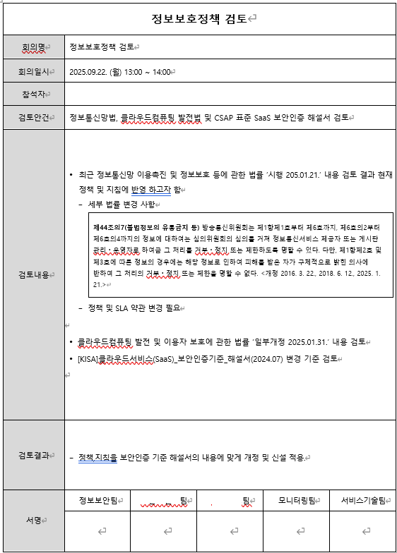 ■ 정보보호 정책 및 시행문서는 최소 연 1회 이상 검토하여야 하고, 검토에 대한 이력을 회의록 등에 기록하고 보관하여야 한다.