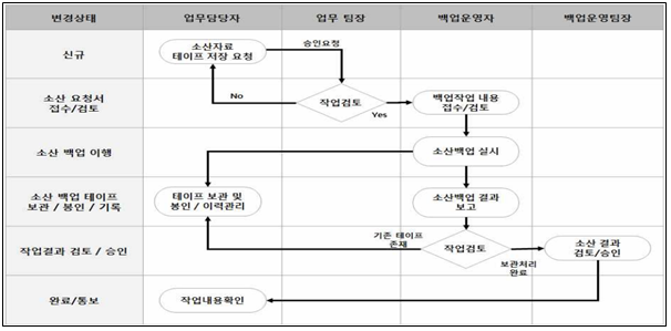 | 구분 | 수행절차 | 수행자 | 양식 | | 1 | ▶ 소산 백업 저장 요청 | 업무담당자 | | | 2 | ▶ 백업담당 부서에 소산 신청 접수 ▶ 백업담당자 소산 작업 내역 검토 ▶ 소산 백업 이행 | 백업담당자 | | | 3 | ▶ 작업 결과에 대하여 업무담당자 및 정보보호 담당자에게 결과 회신 | 백업담당자 | 백업 및 복구 관리대장, 작업결과보고 | |
