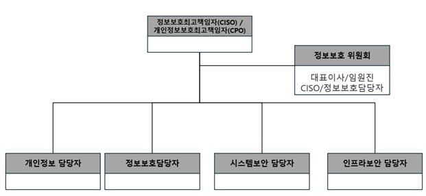- 조직의 규모에 따라 정보보호 조직은 전담 또는 겸임조직으로 구성할 수 있으며 겸임조직으로 구성하더라도 정보보호 조직에 대한 공식적인 선언 또는 지정이 필요함