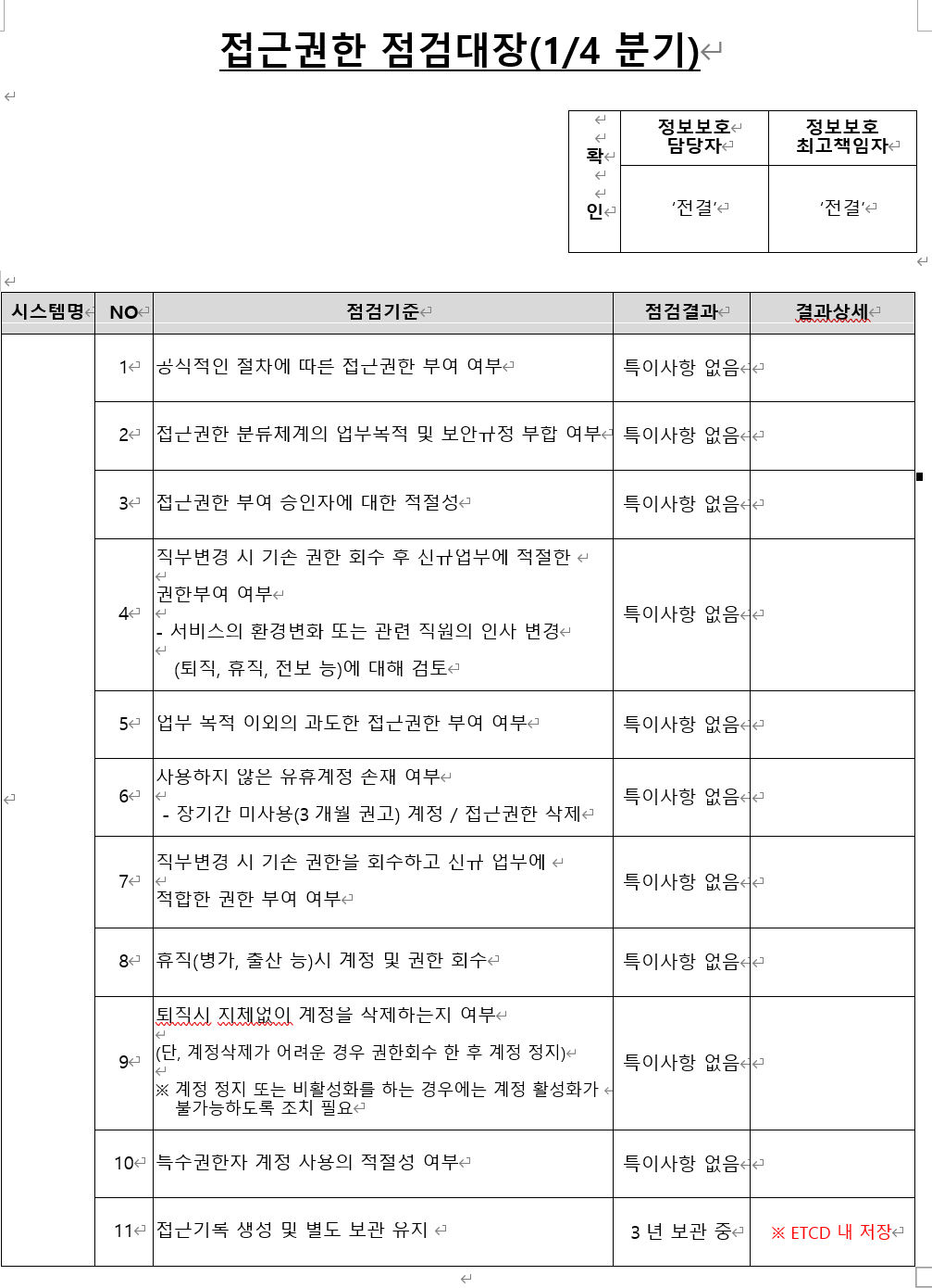 통상적으로 접근점검대장을 작성하며 해당문서로 내부 결재 시스템을 통해 결재를 받습니다.