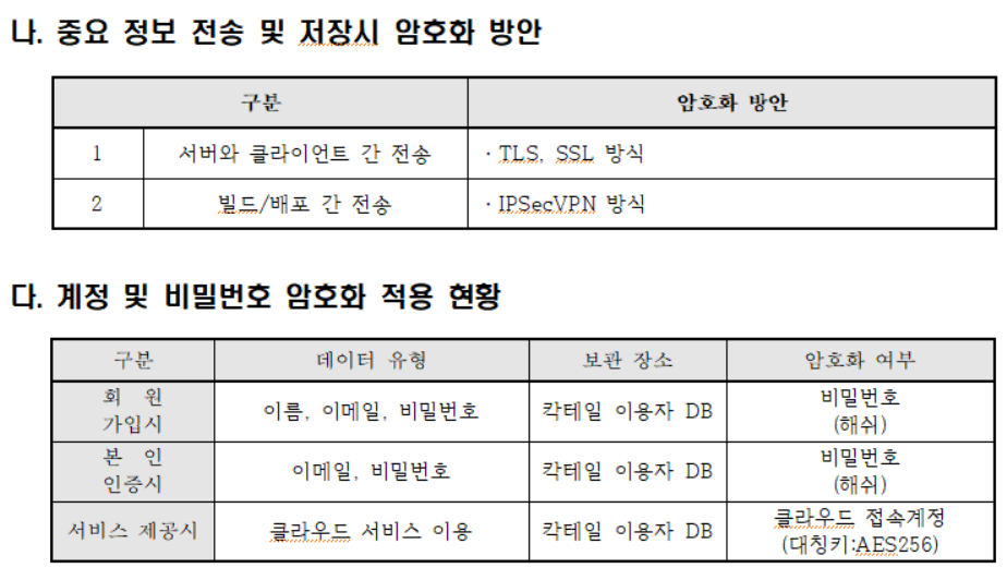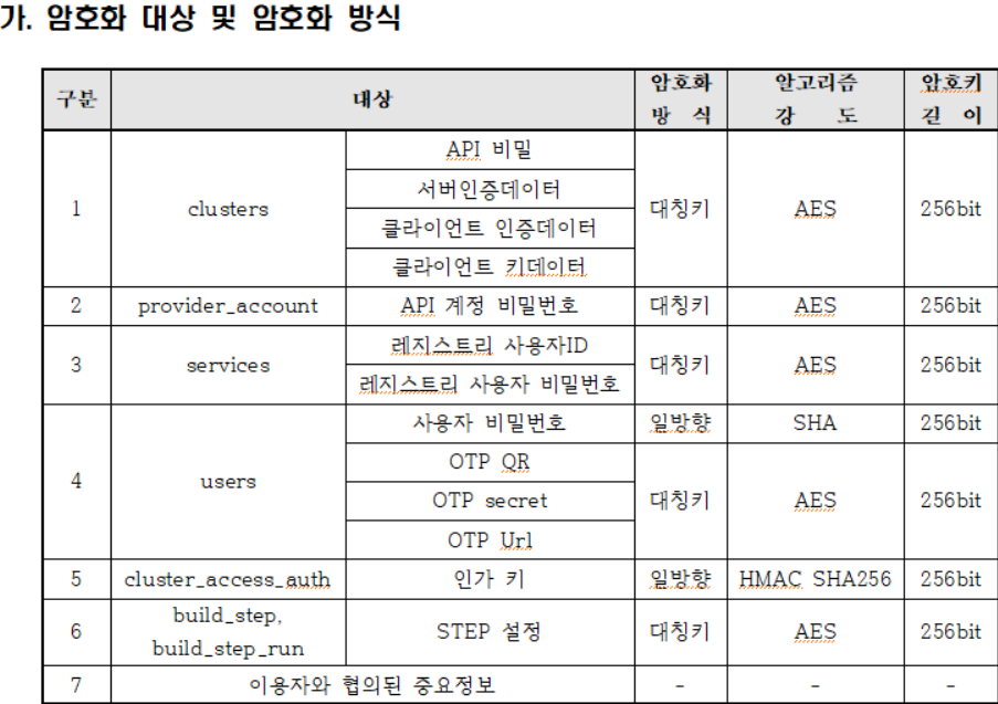 --> 암호화 대상 및 적용 방식을 명시해야 합니다. 보통 자사 서비스에 저장되는 정보중 개인정보,결재정보,민감정보등 유출시 피해를 가 예상되는 정보에 대해 암호화를 진행해야 합니다.